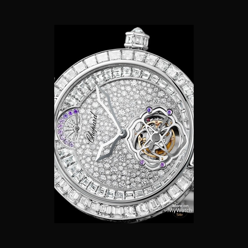 | Plus de caractéristiques : | Mouvement Tourbillon à remontage manuel: L.U.C 02.14-L Diamètre: 29.70 mm Epaisseur: 6.10 mm Nombre de pierres: 33 Fréquence: 28'800 A/h Réserve de marche: 216 heures soit 9 jours 4 barillets technologie Quattro® Ponts décor Côtes de Genève Boîtier Or blanc 18ct Couronne en or blanc 18ct sertie baguettes et briolette Cornes serties diamants cabochons ovales Cadran or blanc 18ct full serti neige baguettes et brillants Réserve de marche full sertie baguettes et améthystes Aiguilles des heures et des minutes rhodiées Aiguille de la réserve de marche et petit seconde noires métallisées Fonctions et affichages Affichage de l’heure et de la minute au centre Petite seconde à 6 heures Indicateur de réserve de marche à 12 heures Bracelet or blanc 18ct full serti baguette |