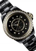En 2024, le Studio de Création Horlogerie de CHANEL associe l’or jaune 18 carats au diamant et présente la nouvelle J12 CALIBRE 12.1. Déclinée en céramique noire et blanche, sa lunette est sertie de 50 diamants taille brillant et son cadran de 12 diamants taille brillant. Visible au travers d’une glace saphir au dos de la montre, le Calibre 12.1 est décoré et doté d’une masse oscillante en forme de cercle parfait, signature de l’Horlogerie CHANEL.
