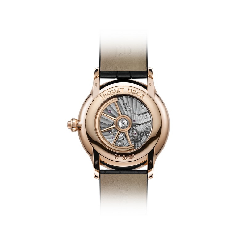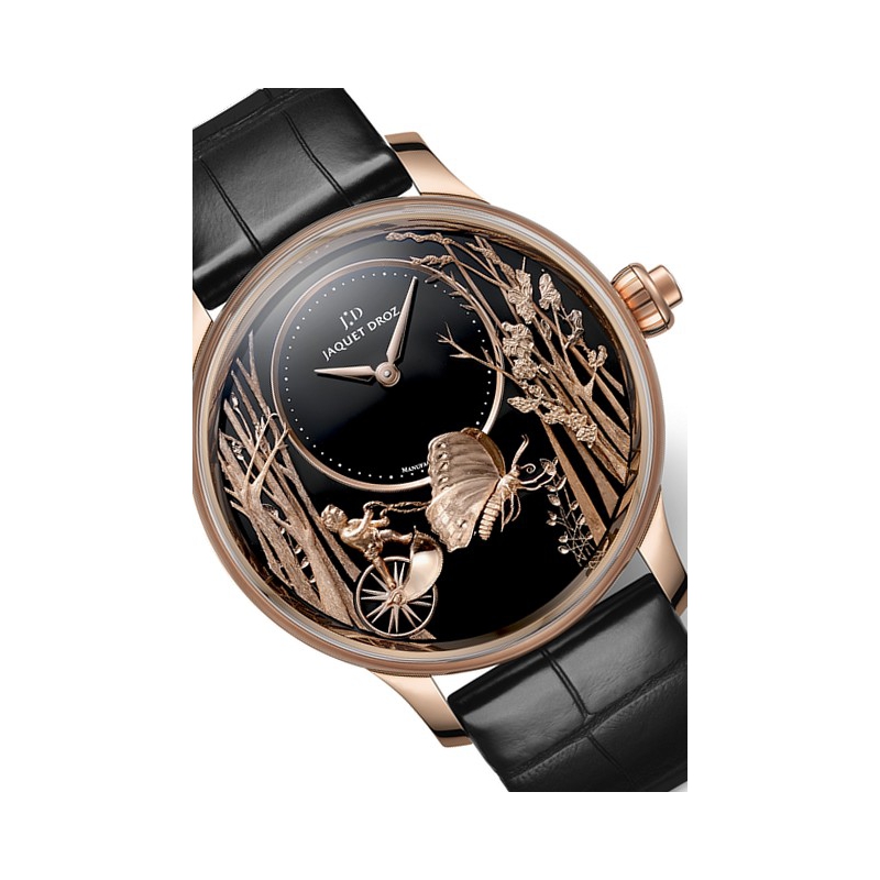 Inscrite dans la prestigieuse collection de montres automates de Jaquet Droz – BirdRepeater, CharmingBird, Lady 8 Flower –,la Loving Butterfly Automatonest une nouvelle prouesse technique et esthétique hors du commun. Le célèbre cadran de la Petite Heure Minute a été ici aménagé à la manière d’un décor de théâtre naturaliste. On entend presque retentir les trois coups : le spectacle peut commencer au coeur d’une délicateforêt, clin d’oeil aux paysages de la région de La Chaux-de-Fonds. C’est ici qu’apparaissent l’angelot et le papillon, réplique de l’esquisse du Dessinateur, automate qui fascina l’Europe entière au XVIIIème siècle. L’émotion est aujourd’hui identique,lorsque, d’une simple pression sur le poussoir de la couronne, un monde de poésie s’anime sous la glace du cadran. Avec grâce et légèreté le papillon prend vie tirant derrière lui un angelot sur son char animé. La roue de ce dernierse met à tourner dans une exquise illusion d’optique rendue possible par l’association de rayons fixes et mobiles, un fabuleux jeu de mouvements illustrant une technique bien connue des créateurs d’automates. L’amour est en marche, et l’émerveillement immédiat devant ce décor aussi onirique que délicieusement raffiné.