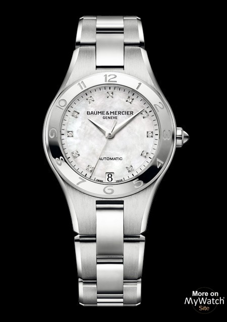Le modèle automatique Linea 10074 est un chef-d’œuvre tout en acier inoxydable avec des rappels de diamants montés sur un séduisant cadran en nacre. Destiné à être lancé en avril 2012, ce garde-temps automatique 32 mm aux courbes ergonomiques doté du système de bracelet interchangeable exclusif de Baume & Mercier (vendu avec un bracelet additionnel) abrite un calibre suisse avec une masse oscillante entièrement décorée. Il indique les heures, les minutes et les secondes, ainsi que la date à 6 heures. Son verre saphir bombé et son fond en glace saphir, avec traitements antireflets, sont résistants aux rayures. Le fond de boîtier transparent permet d'admirer la masse oscillante portant des décors « Côtes de Genève » et en colimaçon ainsi que le symbole Phi, emblème de la marque. Sa lunette gravée et son bracelet biseauté emblématiques arborent des finitions en acier poli-satiné. Le bracelet est quant à lui doté d'un fermoir triple déployant avec sécurité. Cette édition est proposée avec un cadran en nacre finition azuré orné de 11 magnifiques diamants. Elle est étanche à 50 mètres (5 ATM), pour allier la fonctionnalité à l'élégance.