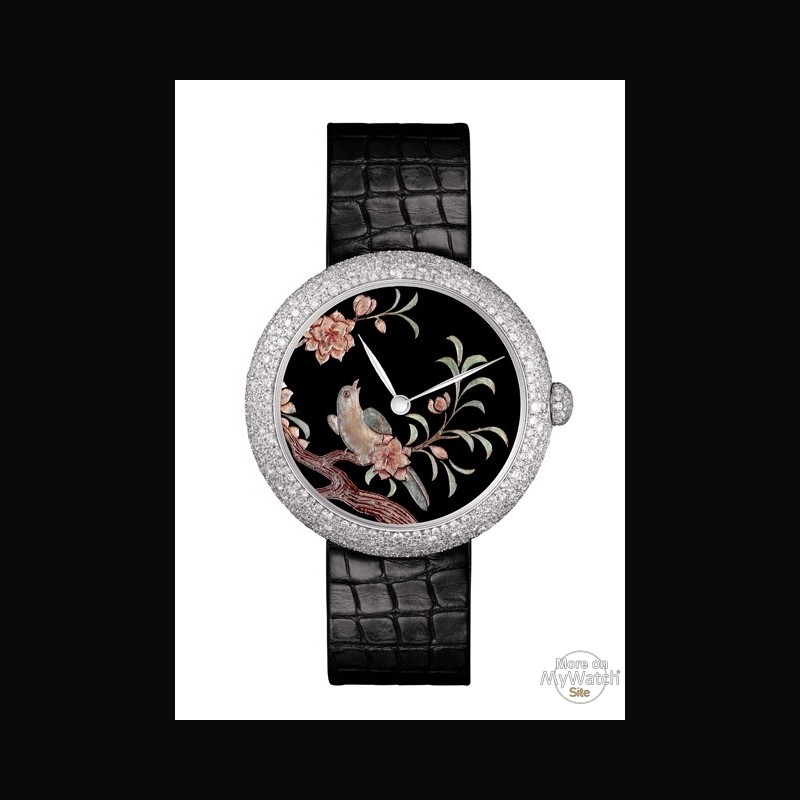 | Plus de caractéristiques : | Pièce unique manufacturée en Suisse Mouvement mécanique à remontage automatique Réserve de marche : 42 heures Boîte en or blanc 18 carats. serti neige de diamants (~4 carats) Couronne en or blanc 18 carats. serti neige de diamants Fond gravé main en or blanc 18 carats Cadran en or jaune 18 carats et onyx. miniature en OR BEIGE 18 carats. opale rose. opale blanche. nacre rose et émail. réalisée selon la technique de la glyptique Aiguilles en or blanc 18 carats Bracelet en alligator Mississipiensis noir Boucle dépliante en or blanc 18 carats serti de 80 diamants (~0.49 carat) |