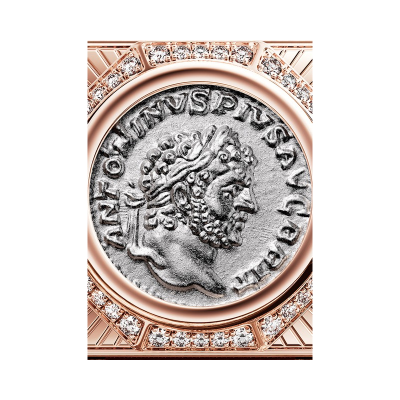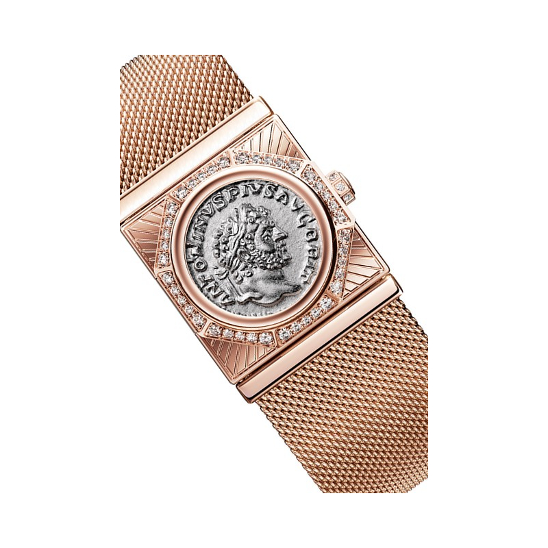La montre Monete est à la croisée du temps et de l’art. La joaillerie italienne et l’horlogerie suisse se perçoivent dans chaque détail. Bvlgari a voulu agrémenter cet hommage à la Rome éternelle d’une boucle ardillon, une première pour la collection. Avec cette montre, la Maison laisse libre cours à sa vision plurielle à travers un mélange des genres : le symbolisme d’une pièce ancienne, la pureté géométrique de l’octogone et la texture tout en finesse de la maille milanaise.