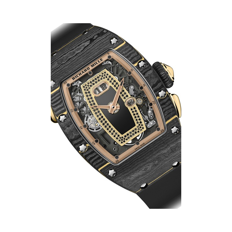 La RM 07-01 brille par le savoir-faire qu’elle incarne, et par la sensualité qui se dégage des lignes courbes de son boîtier tonneau en Carbone TPT® Or. Elle est animée par le calibre maison CRMA2, un mouvement automatique squeletté. Un élégant contraste entre robustesse du mouvement et délicatesse, caractéristique de la rigueur appliquée à chaque modèle.