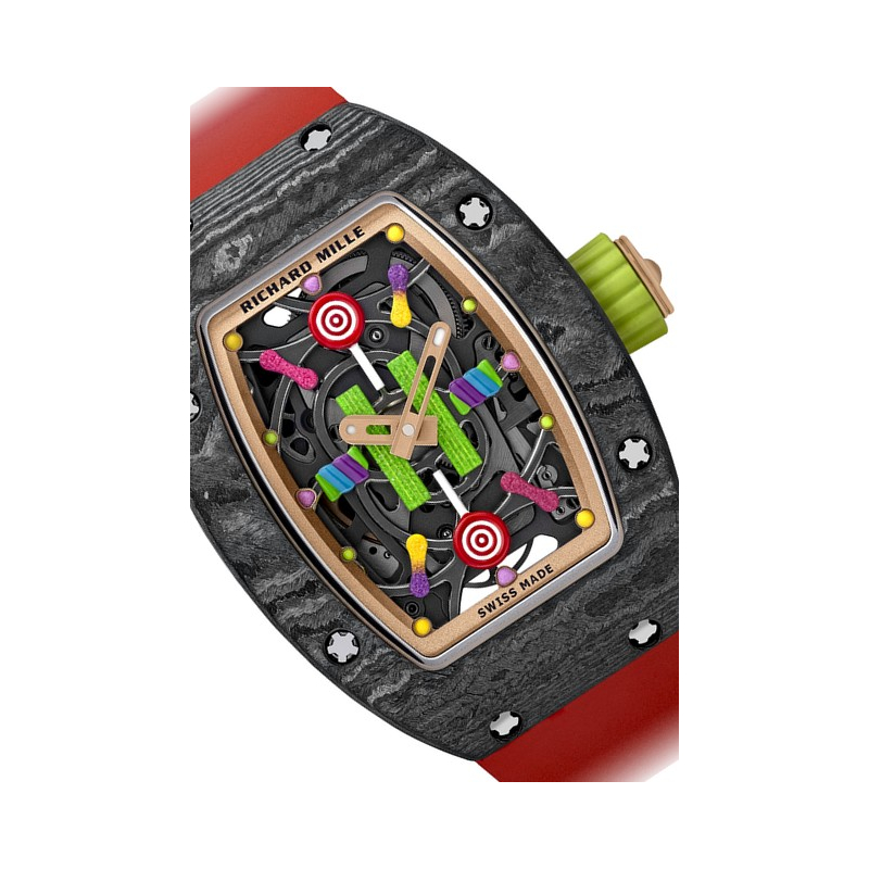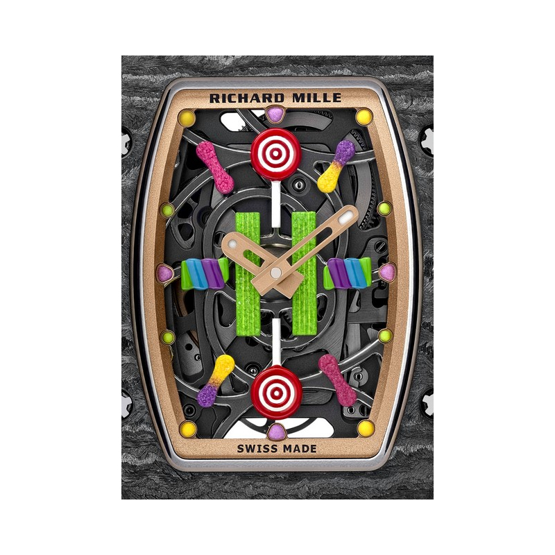 La ligne Fruits, clin d’oeil à l’idée même de gourmandise, décline six parfums : Citron et Fraise (RM 16-01), Myrtille et Litchi (RM 07-03) ou encore Kiwi et Cerise (RM 37-01) représentés à travers leurs boîtiers respectifs en Quartz TPT® coloré et Carbone TPT®. Aux dégradés permis par les variations du nombre de strates superposées alternant noir du Carbone TPT® et couleurs du Quartz TPT® est venue s’ajouter une teinte turquoise, inédite et exclusive à cette collection. Pour parfaire le réalisme des 3 000 figurines, peintes à l’acrylique et laquées à la main, l’effet « cristaux de sucre » a été obtenu grâce à de l’émail broyé conjugué à l’emploi du sable très fin utilisé pour les sabliers. Posés sur des plaques de titane grade 5, rubans acidulés, sucettes torsadées, boules de gomme, ou encore quartiers d’agrumes, tous sont travaillés et ajourés avec la même précision que des composants horlogers.
