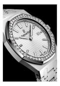 La carrure, la lunette sertie de 40 diamants taille brillant, la couronne, le bracelet et la boucle déployante sont façonnés dans l’acier. Le jeu subtil et l’alternance des surfaces satinées et polies - caractéristiques des premières Royal Oak – soulignent les lignes franches de ce modèle de 33 mm, de même que les 8 vis hexagonales de la lunette octogonale sont en or gris, un matériau inchangé depuis le modèle originel de 1972. Etanche à 50 mètres, le boîtier présente une glace traitée anti-reflets. Le bracelet, parfaitement intégré au boîtier, révèle cette esthétique unique propre à la collection caractérisée par un assemblage parfait de maillons et plots intermédiaires décroissants. Une nouvelle boucle déployante Audemars Piguet à triple lame caractérisée par un système de fermeture à double sécurité fait son apparition.