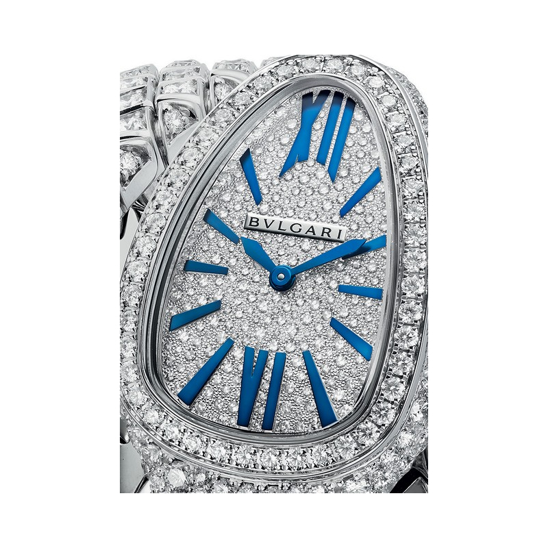 | + Plus de caractéristiques : | Mouvement Mouvement à quartz de haute précision personnalisé par Bvlgari Boitier Serpenti de haute joaillerie en or blanc 18 carats sertis de 205 diamants taille brillant (2,99 cts) Cadran Décoré de 257 diamants sertis en pavé de neige (0,72 ct) Bracelet Deux rangs en or blanc 18 carats serti de 425 diamants taille brillant (17,04 cts) |