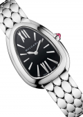 Irrésistible, Serpenti Seduttori naît en 2019, inspirée par l’iconique Tubogas. Les serpents – « serpenti » en italien – font vibrer l’imagination et les designs de Bulgari depuis ses débuts. Symbole de force, de vitalité, de renouveau, cet animal mystique devient séduction absolue et féminité rayonnante avec la Serpenti Seduttori. Inimitable, la boîte-signature déroule ses courbes en forme de tête de serpent. Bulgari la prolonge d’un bracelet motif écailles – « scaglie » – hexagonales, parfaitement intégré, telle une seconde peau sensuelle, inspirée des montres Serpenti à secret des années 60. Le bracelet s’articule en une exquise répétition géométrique d’éléments nés d’un savoir-faire virtuose. Les lignes iconiques de la Serpenti Seduttori prennent vie grâce au savoir-faire de la manufacture horlogère Bulgari, en Suisse. Au gré des créations, matières et pierres précieuses renforcent son pouvoir d’attraction. Pour métamorphoser chaque instant en ce qu’il y a de plus précieux.