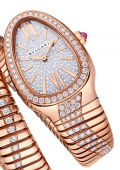 | Plus de caractéristiques : | Mouvement Mouvement à quartz de haute précision personnalisé par Bulgari Boitier Galbée de 35 mm en or rose sertie de 8 diamants Cadran Cadran pavé de 262 diamants Bracelet / Boucles Bracelet un tour en or rose partiellement serti de 131 diamants. (~ 3,25 ct) Total de 445 diamants (~ 4,85ct) |