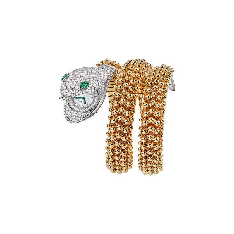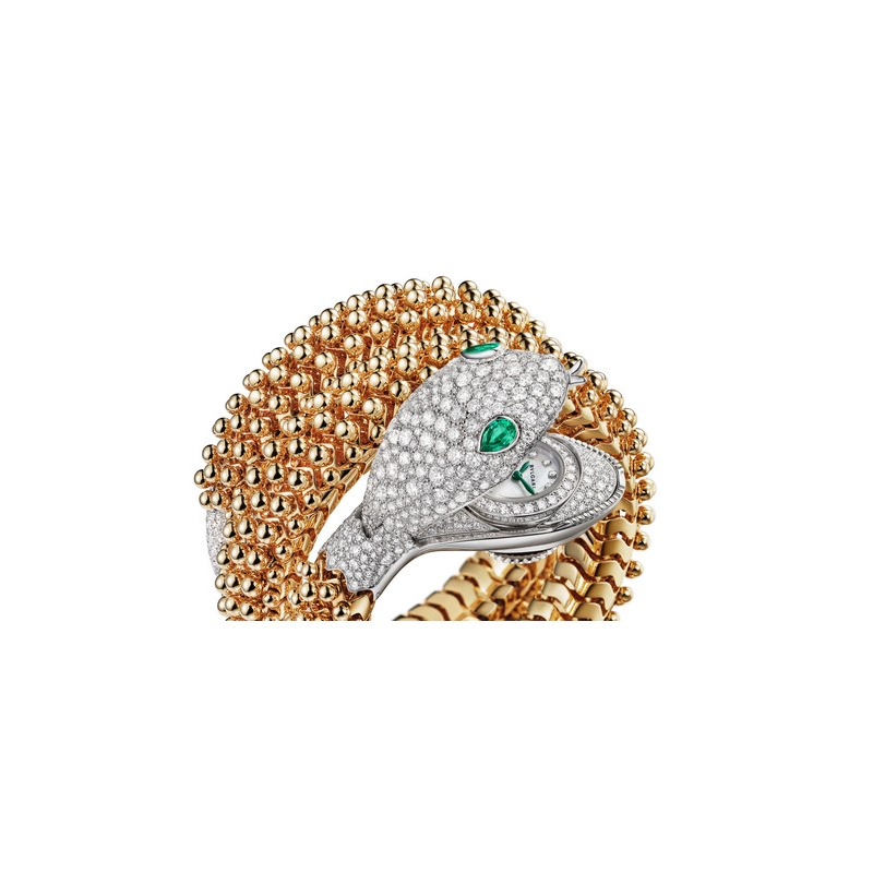 | + Plus de caractéristiques : | Mouvement Micro-mouvement mécanique de manufacture à remontage manuel Piccolissimo BVL100 (2,55 mm d’épaisseur) Réserve de marche : 30 heures Fréquence : 21 600 VpH (3Hz) Boitier Montre secrète Serpenti Pallini Haute Joaillerie, or blanc et or jaune, sertie de diamants ronds de taille brillant (7,53 ct) et de 2 émeraudes de forme poire pour les yeux (0,48 ct) Cadran Cadran en nacre avec des diamants en guise d’index (0,05 ct) Bracelet Bracelet à deux spirales |