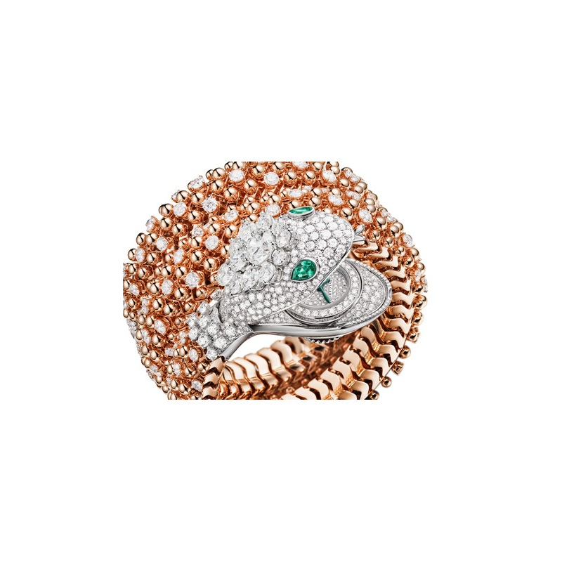 | Plus de caractéristiques : | Mouvement Micro-mouvement mécanique de manufacture à remontage manuel Piccolissimo BVL100 (2,55 mm d’épaisseur) Réserve de marche : 30 heures Fréquence : 21 600 VpH (3Hz) Boitier Montre secrète Serpenti Pallini Haute Joaillerie, or blanc et or rose, 1 diamant rond de taille brillant (1,5 ct), diamants ronds de taille brillant (22,94 ct), 2 émeraudes de forme poire pour les yeux (0,48 ct) Cadran Cadran pavé de diamants (0,28 ct) Bracelet Bracelet à deux spirales |