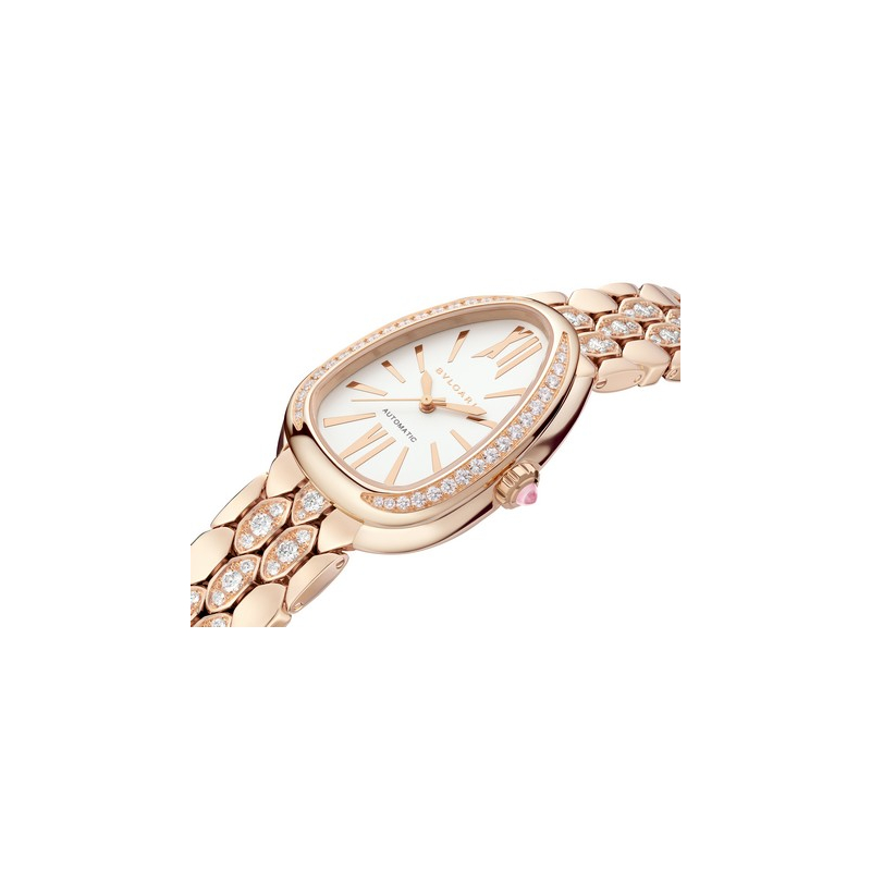 Les nouvelles Serpenti Seduttori Automatic se déclinent en deux variantes exceptionnelles, chacune exprimant une facette de la vision de la féminité selon Bvlgari : rayonnante, précieuse, raffinée. D'une part, elles célèbrent l'héritage des pierres dures avec un cadran en malachite. La malachite est plus qu'un simple matériau ; c'est une déclaration, un témoignage vibrant de l'art de la nature, méticuleusement intégré pour évoquer une élégance profonde et un lien avec la beauté intemporelle de la terre. Une rubellite rose taille cabochon couronne le boîtier, faisant écho aux aiguilles et aux index plaqués or rose. Le boîtier en or rose est doté d'une lunette en or rose sertie de 36 diamants ronds taille brillant. D'autre part, embrassez la préciosité de Seduttori avec un bracelet serti de 117 diamants taille brillant. Boîtier et lunette en or rose sertis de 36 diamants ronds taille brillant.