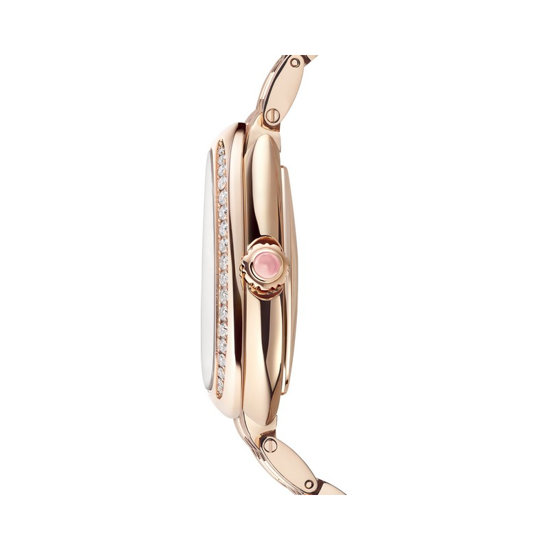 | + Plus de caractéristiques : | Mouvement Remontage automatique - Mouvement maison BVS100 Lady Solotempo Réserve de marche : 50 heures Boitier Or rose sertis de 36 diamants ronds taille brillant (0,6 ct) Cadran Opalin blanc Bracelet / Boucles Bracelet souple en or rose serti de 117 diamants taille brillant (2,8 carats) avec boucle déployante |