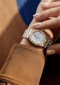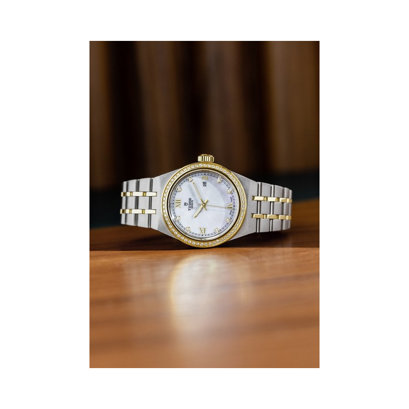 Avec son bracelet métallique intégré qui assure une ligne ininterrompue avec le boîtier, TUDOR Royal mise sur la fluidité et un style assuré. Caractérisé par ses trois larges maillons satinés entrecoupés de deux éléments plus fins polis, la douceur de ses surfaces et surtout de ses arêtes, ce modèle illustre l’attention que TUDOR porte au confort de porter. Disponible en acier ou dans une alternance d’éléments en acier et en or jaune, les modèles de cette ligne s’adaptent à tous les goûts grâce à des finitions soignées. Disponible dans quatre diamètres, TUDOR Royal trouvera sa place sur les poignets de toutes tailles. La version 41 mm bénéficie d’un traitement particulier puisque son mouvement mécanique lui permet un affichage à la fois du jour et de la date. La version 28 mm est dotée d’un cadran en nacre avec une lunette sertie de diamants.